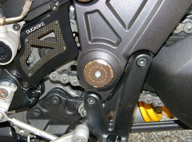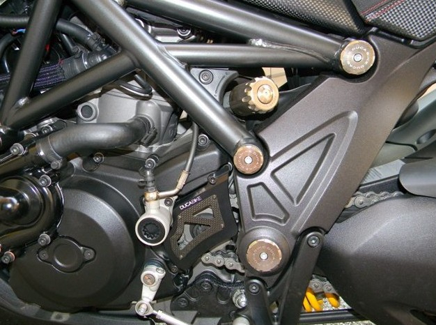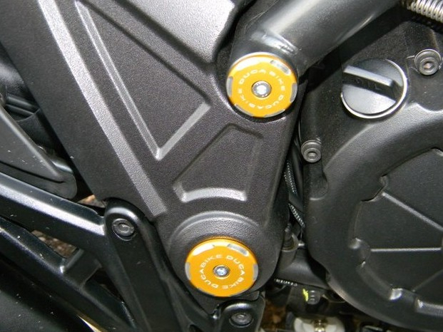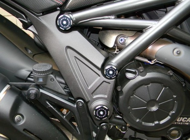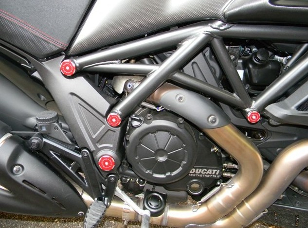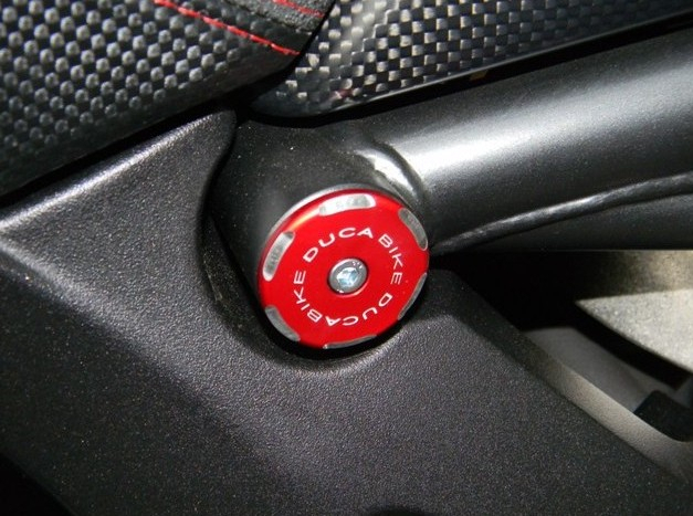 The Diavel kit frame plugs from DUCABIKE is anodized colored, billet alluminum.