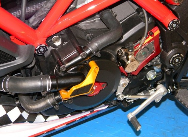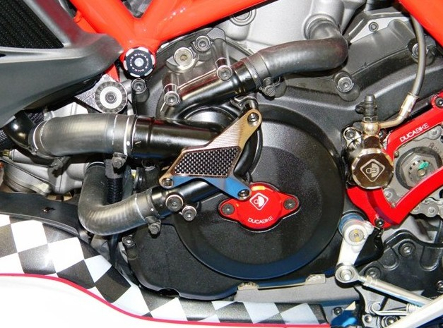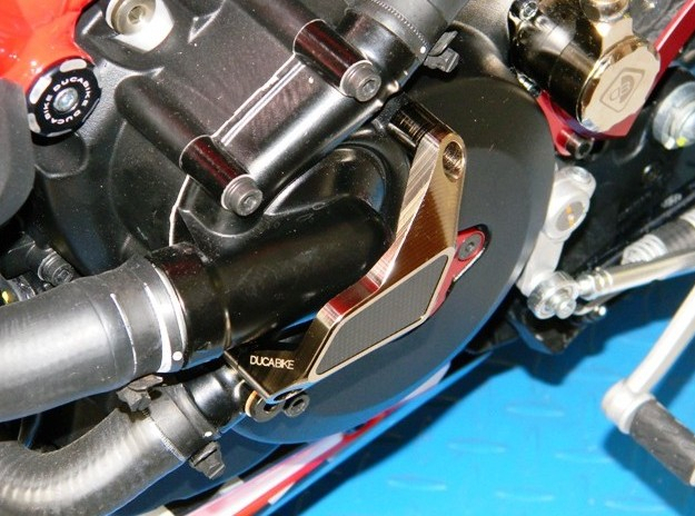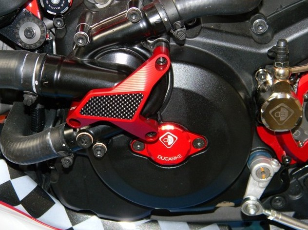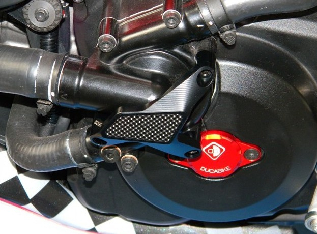 The water pump protection from DUCABIKE is alloy from worked full, colored anodized surface with application of carbon fiber.