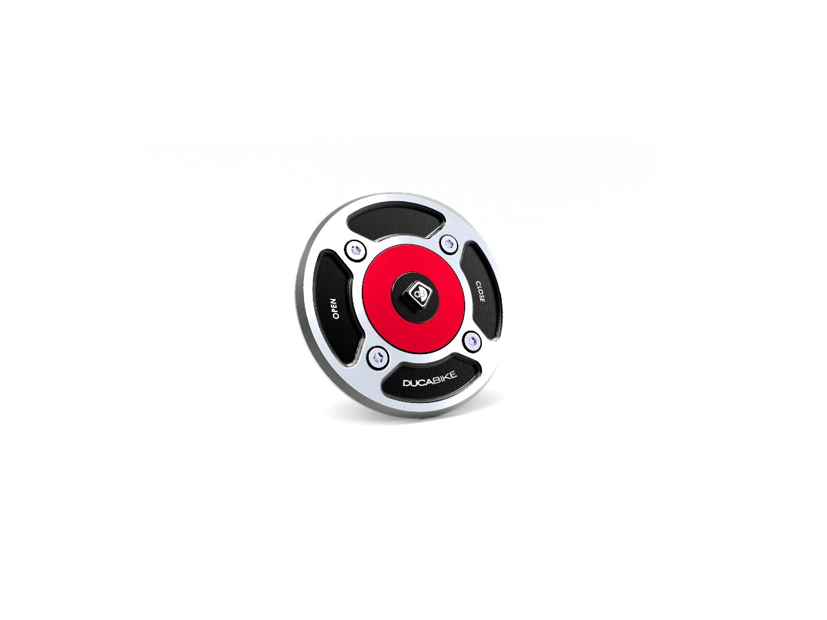 The fuel tank cap from DUCABIKE is billet alloy, surface anodized colored, carbon key fiber.