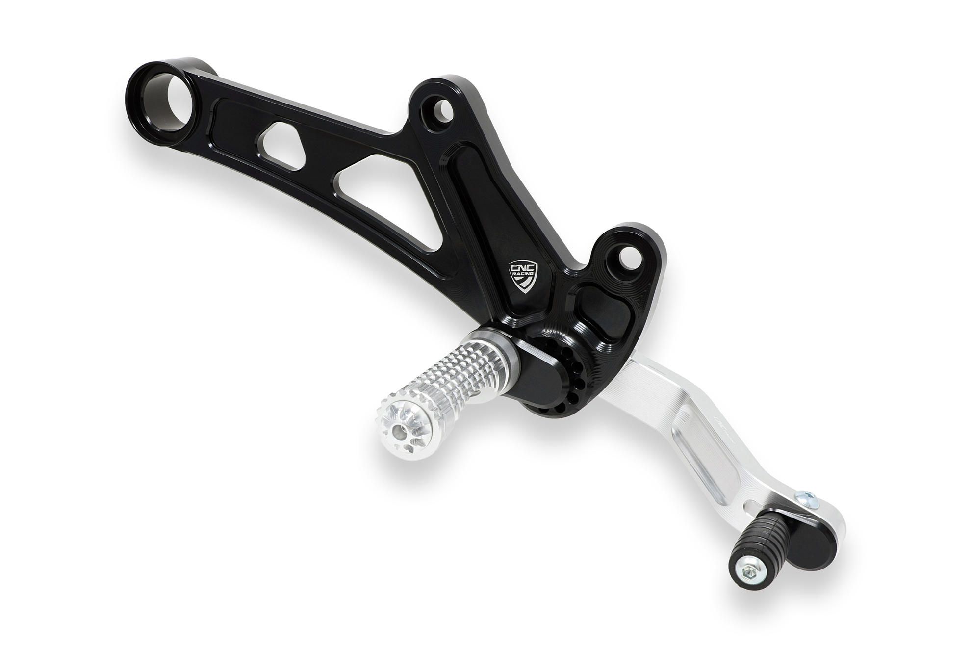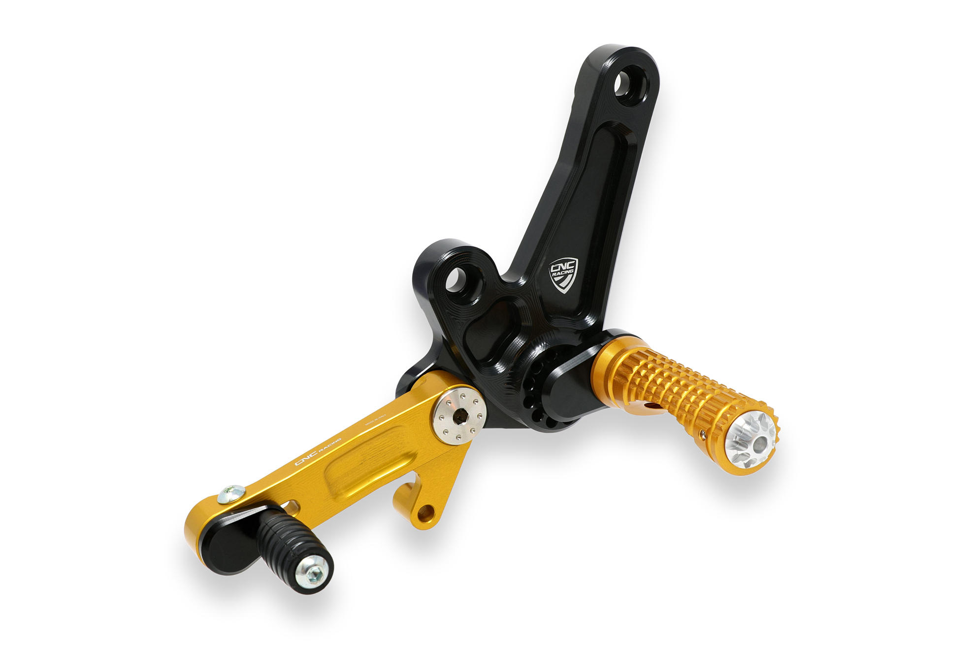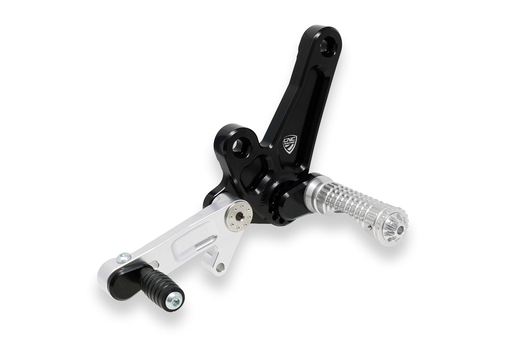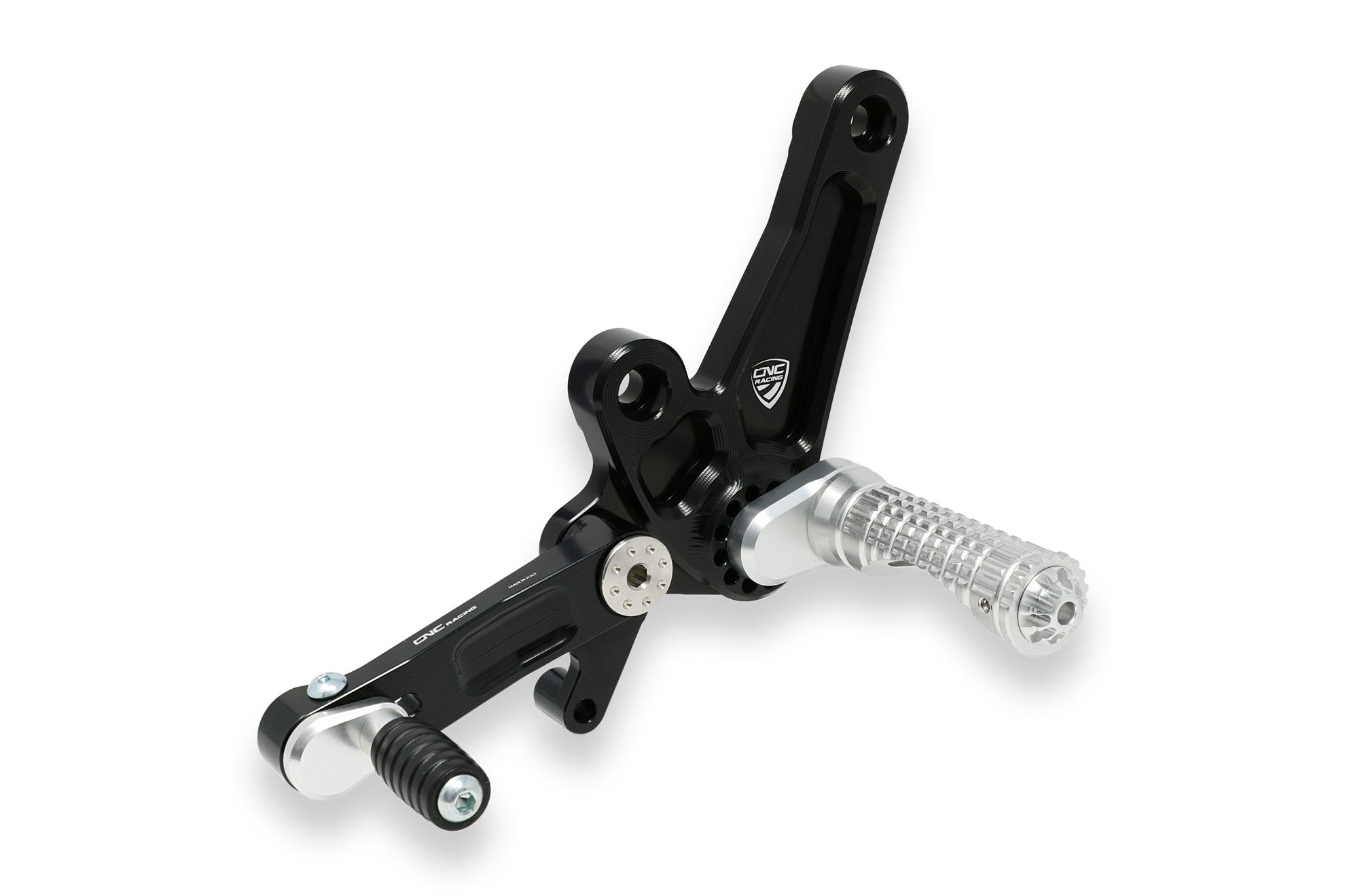 The adjustable rearset from CNC RACING is machined from light alloy billet and then given an anodized surface finish.