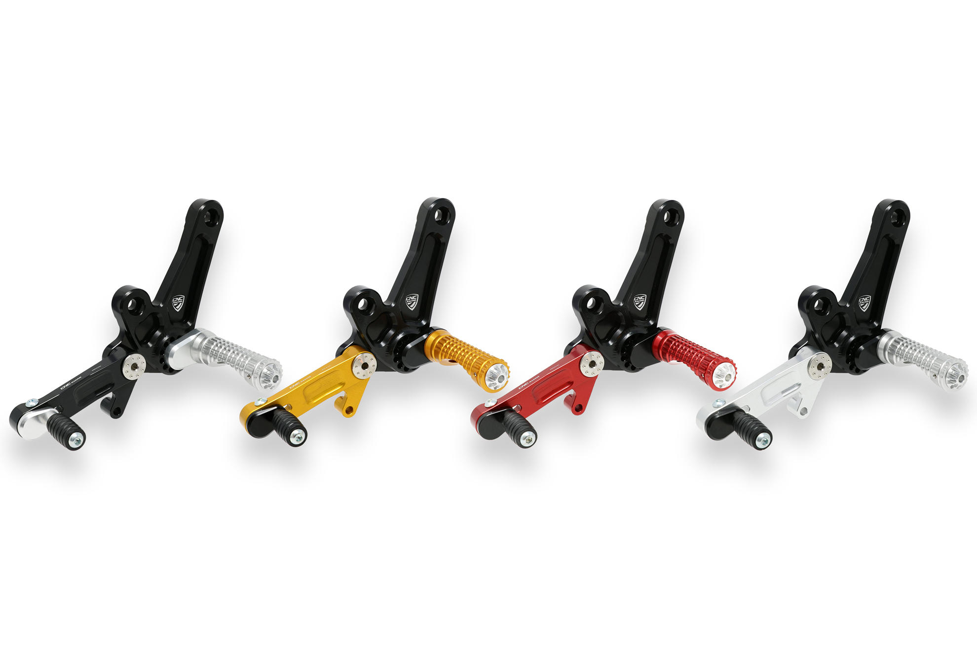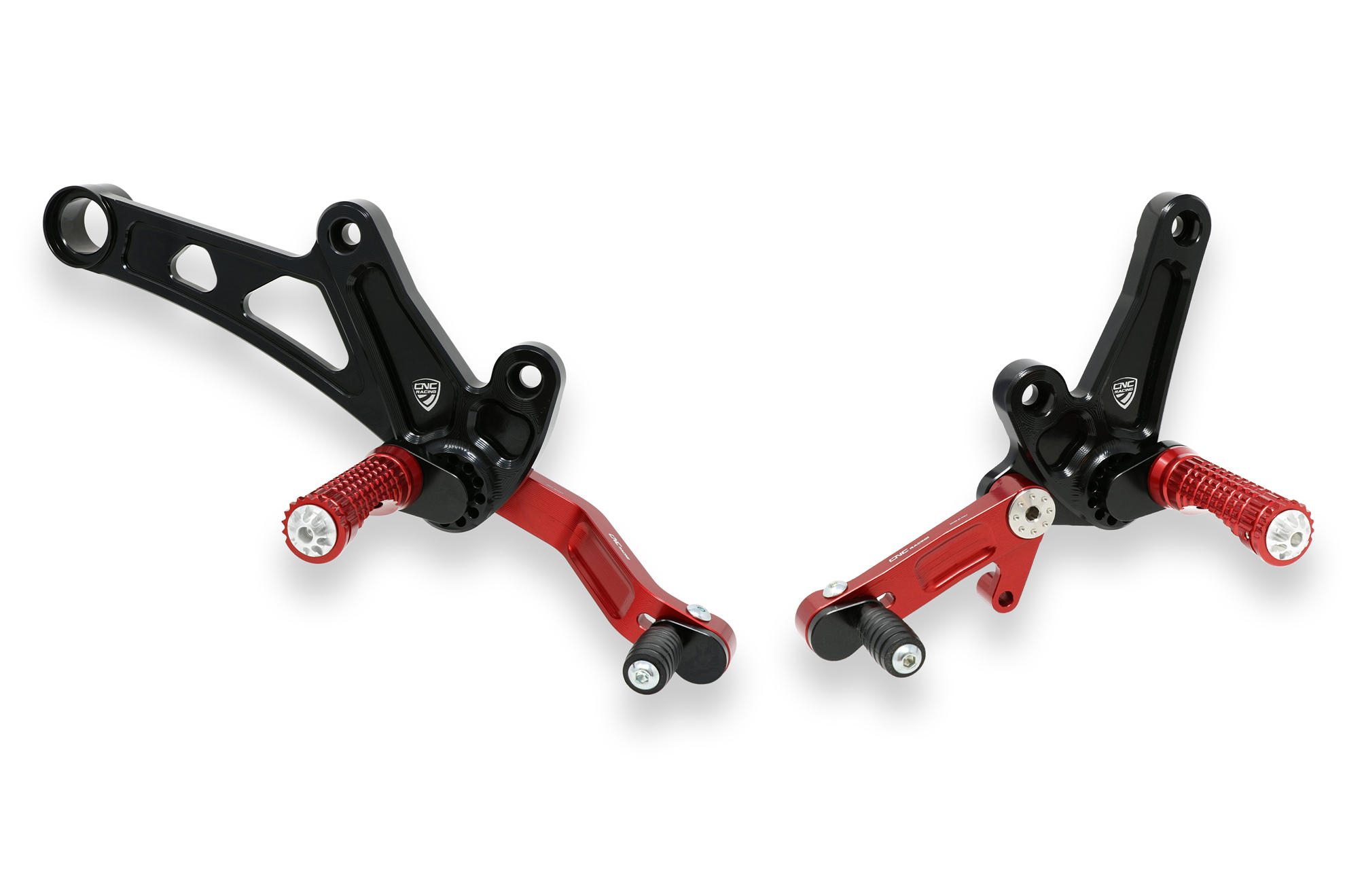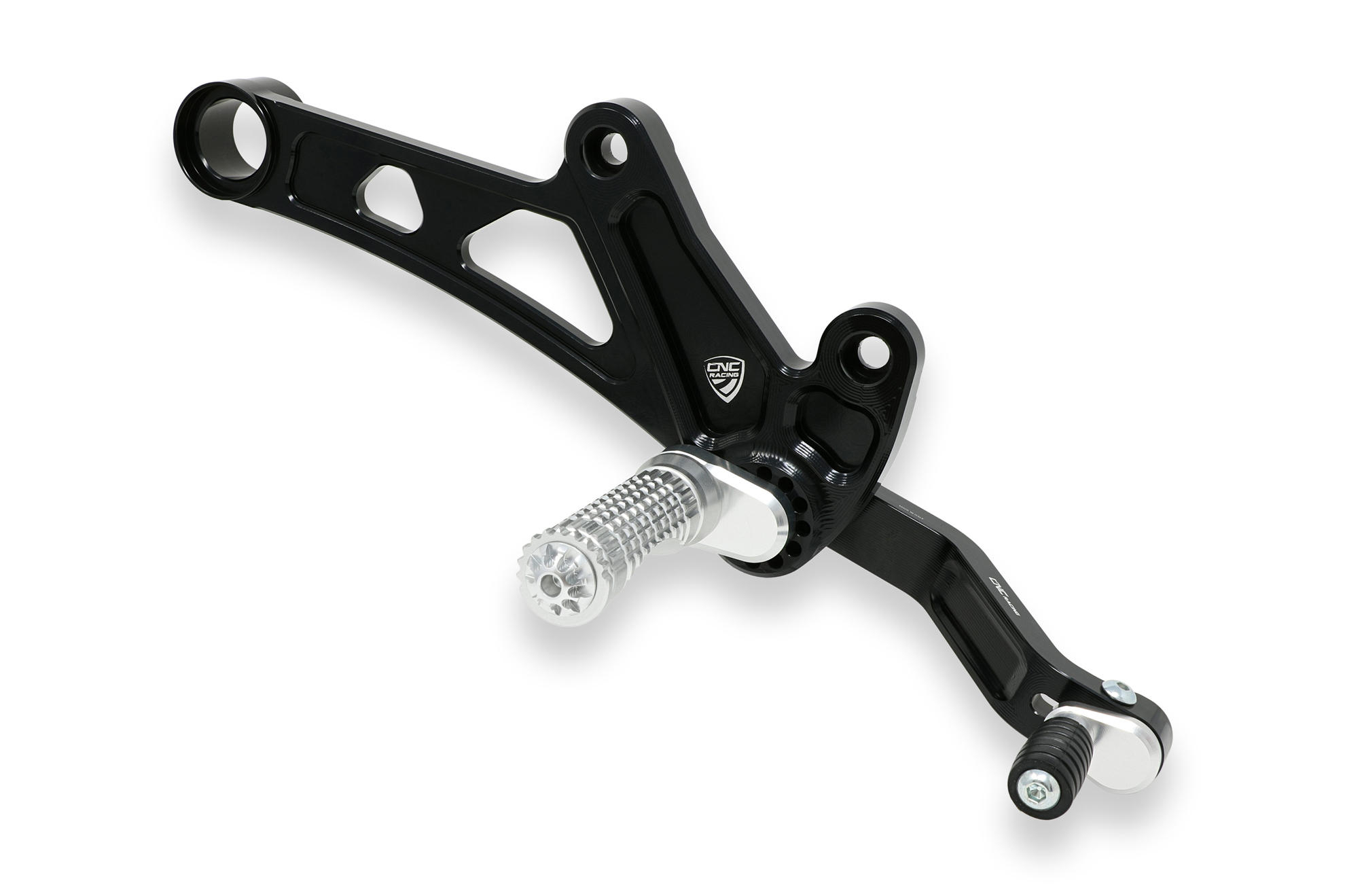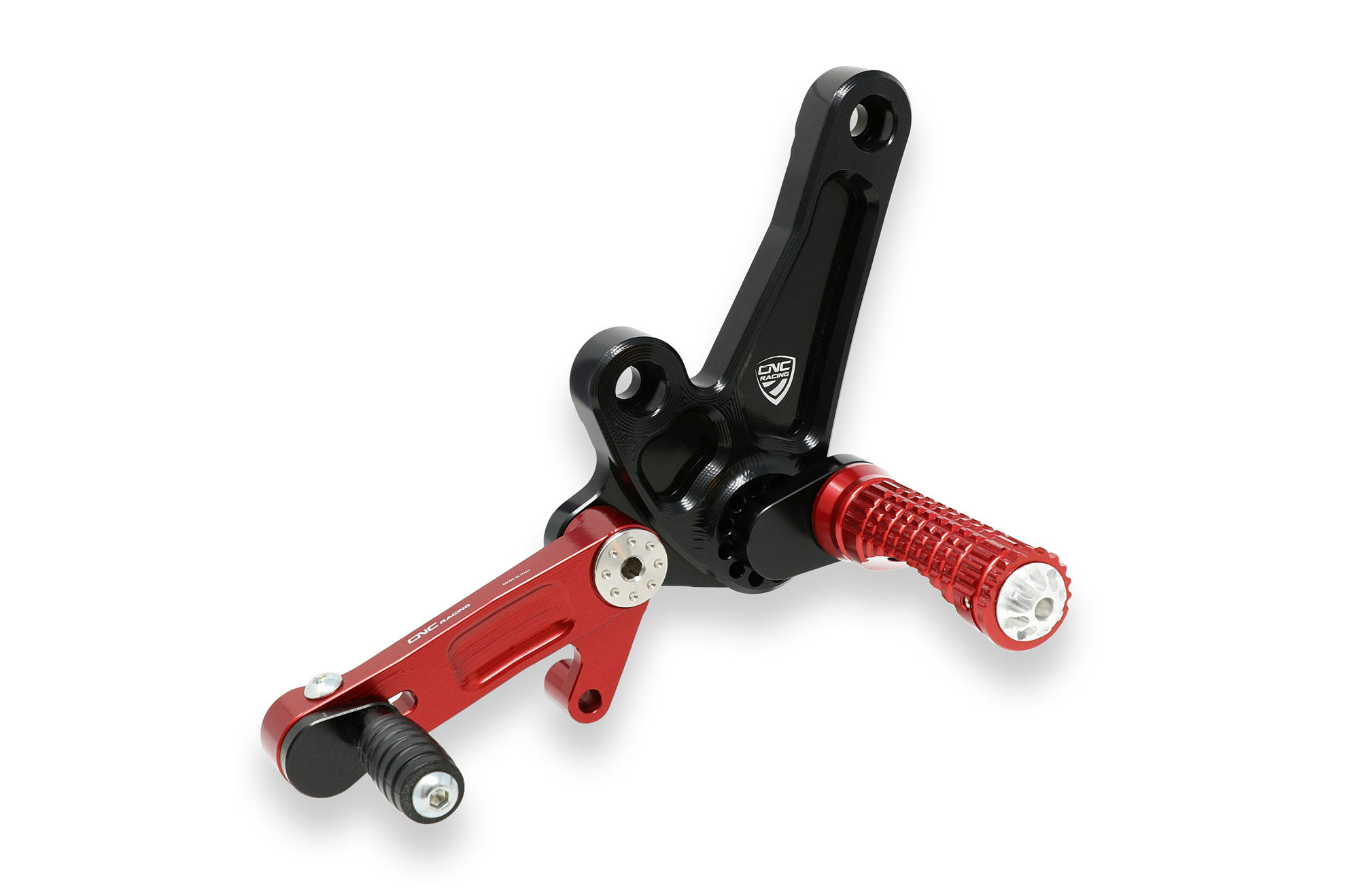 The adjustable rearset from CNC RACING is machined from light alloy billet and then given an anodized surface finish.